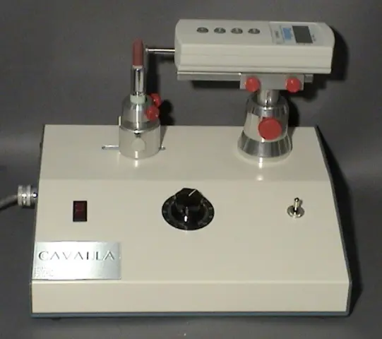 The lipstick testing unit is a custom fabricated machine for testing the strength of a lipstick by measuring the point at which a lipstick fractures. Combines both breakage and crushing modes in a single unit.