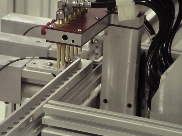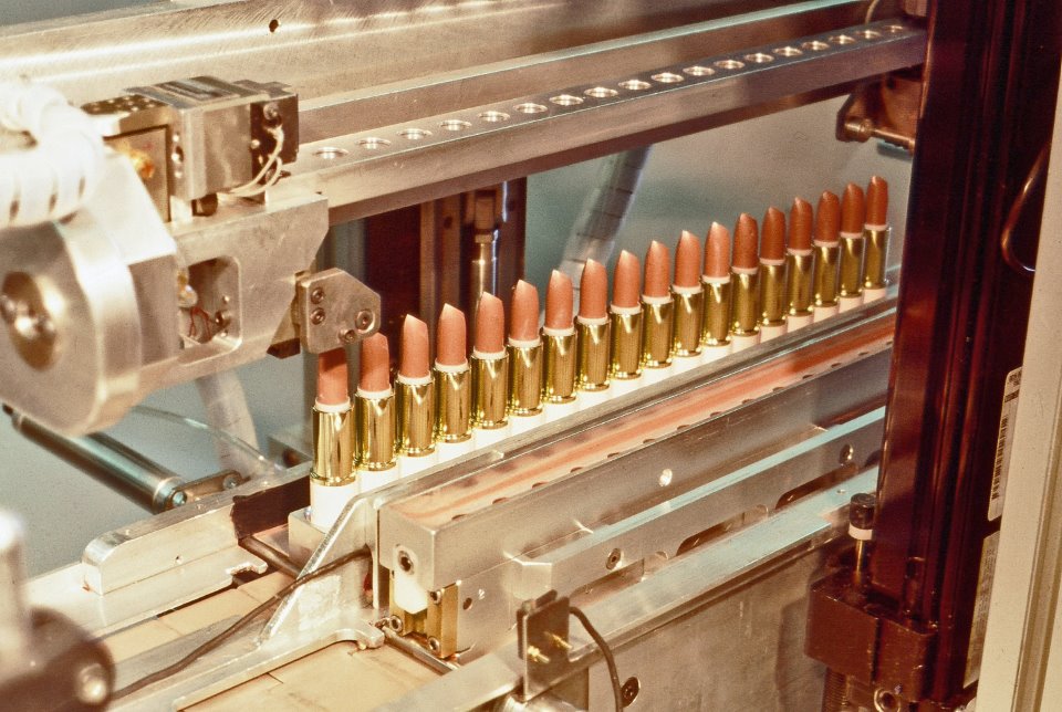 Automated refrigeration system Cavalla Flexfill bottom bottom up filling system System 072 automatically transfers 72 + lipsticks per minute from mold to case